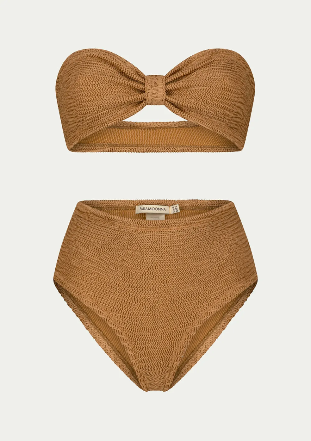 Two-piece swimsuit BETTY by PARAMIDONNA in one size. Made of premium, high-quality fabric with excellent elasticity, it guarantees a comfortable and secure fit for sizes XS to 2XL.The top is a stylish bandeau featuring an interesting detail highlighting the bust and giving a chic look. The bikini bottom is high waisted and elegantly shapes the waist providing coverage and comfort. The BETTY model combines chic design with functionality.