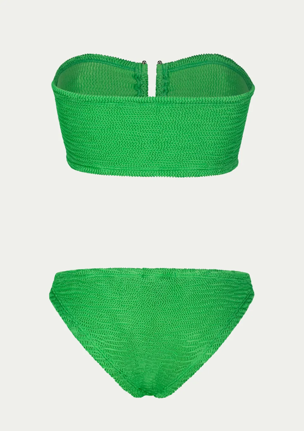 Low waisted two piece swimsuit in a fresh summer color. The fabric’s high elasticity allows the swimsuit to fit through six sizes – from XS to 2XL. The set has a classic bandeau bikini style featuring a hook accent at the front. It provides medium support and is suitable for women with smaller bust. The bikini bottom is low waisted. To maintain the swimsuit’s high elasticity and bright color, please hand wash it with soap and warm water. Do not tumble-dry, only air-dry.