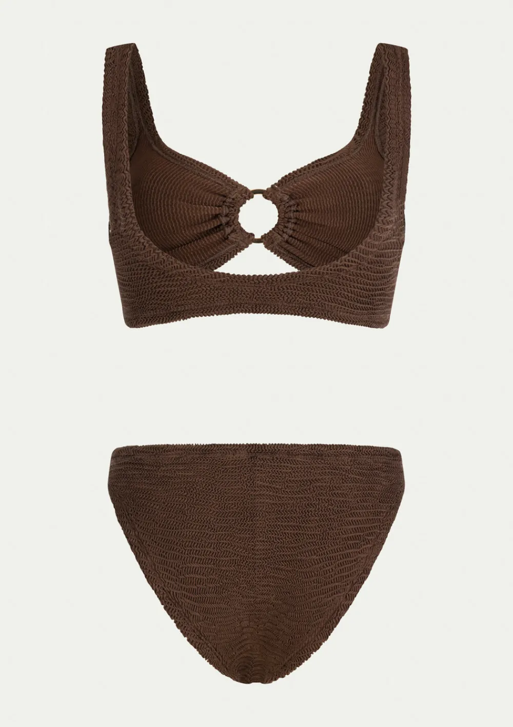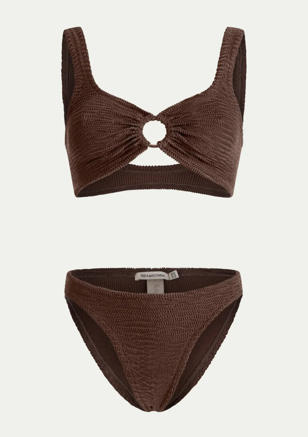 Two-piece swimsuit IRINA CHOCO by PARAMIDONNA, available in one size to fit XS to 2XL. Crafted from high-quality fabric with strong elasticity, ensuring a comfortable and secure fit for various body types. The top features a stylish two-strap bustier with a connecting decorative ring in the middle, enhancing and shaping the bust. The low-waisted bikini bottoms boast a moderate cut for a flattering silhouette. The IRINA set is PARAMIDONNA’s best-selling model, known for its exceptional stability and ability to accentuate the bust.