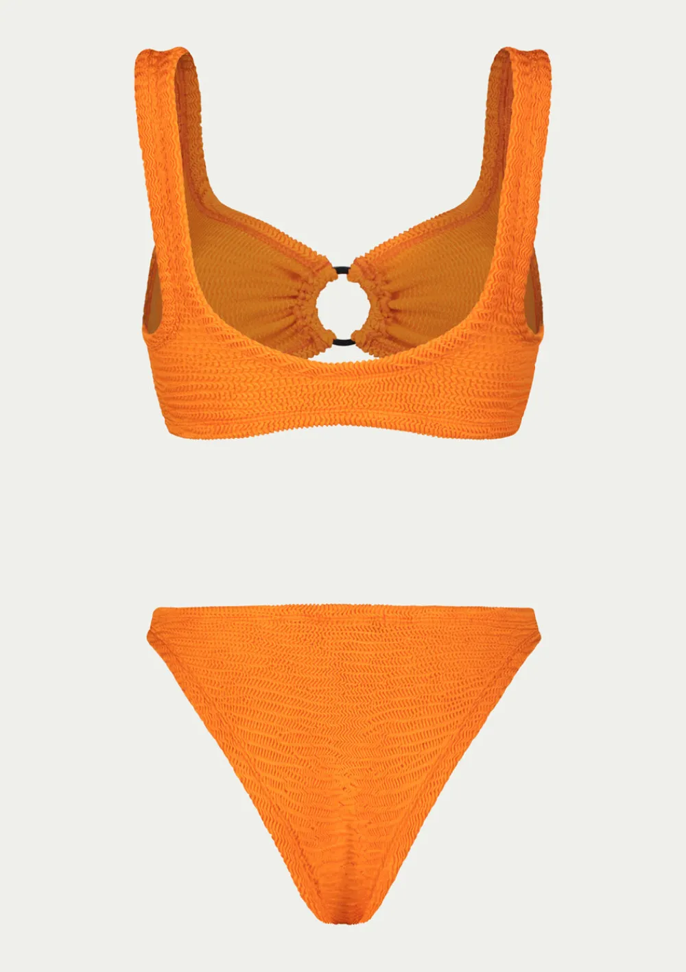 Two piece IRINA in orange color. The highly elastic material allows this one size suit to fit all between XS and 2XL. There is a frontal hoop detailing. The bottom is low-waisted. Please, follow the instructions on the care tag and hand wash the item with soap and warm water. Do not tumble-dry, only air-dry.