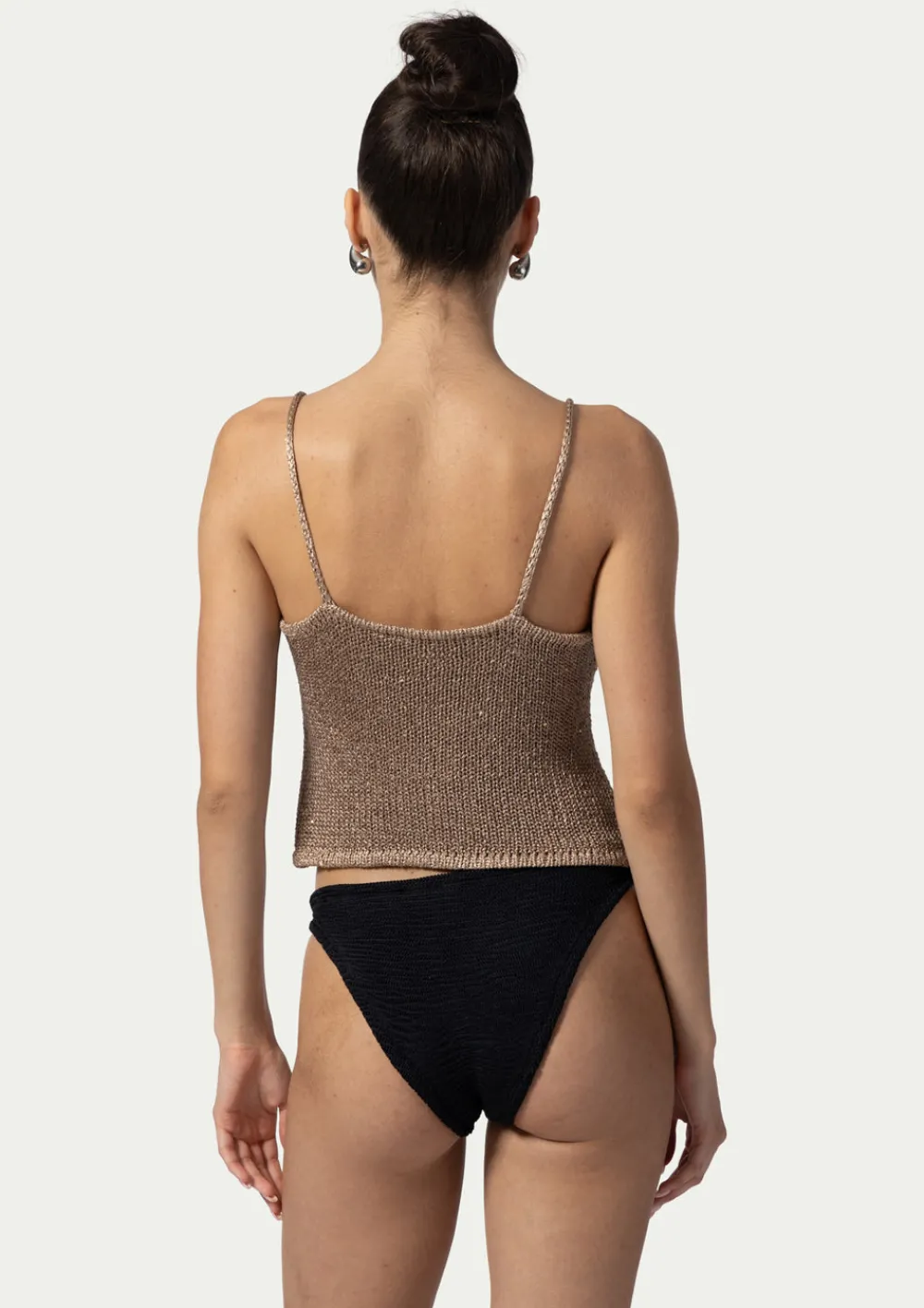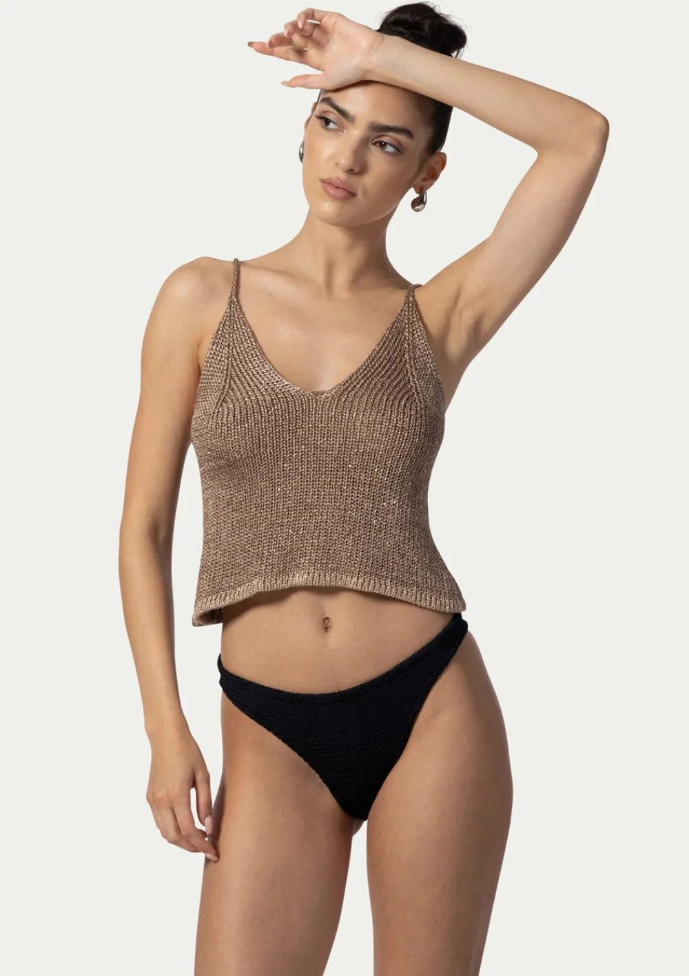 The BRUNA TOP by PARAMIDONNA is a delicate knit made from 100% silk yarn, available in sizes XS/S and M/L. This lightweight, cropped top with thin straps features a subtle sheen that adds elegance to its minimalist design. The soft silk yarn offers a luxurious feel, making it ideal for warm summer days or stylish evenings out. Whether paired with the matching Bruna Skirt or worn on its own, the BRUNA TOP combines comfort and sophistication effortlessly.