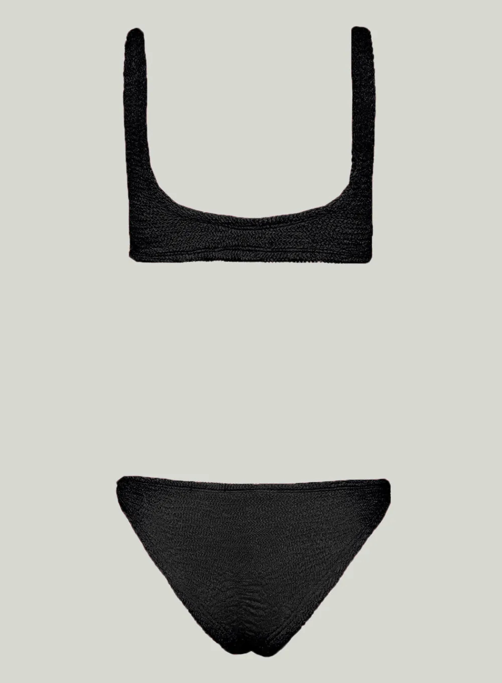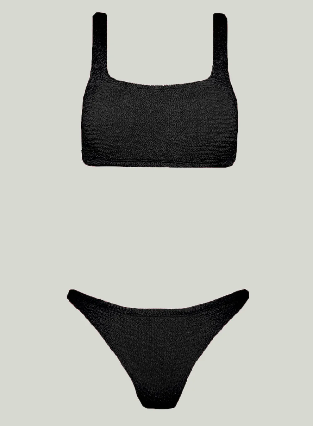 Two piece swimsuit EMILY BLACK by PARAMIDONNA. One size design that fits through sizes from XS to 2XL. The top is shaped like a classic sports bra with two straps. Low-waisted bottom. To maintain the swimsuit’s high elasticity and bright color, please handwash it with soap and warm water. Do not tumble-dry, only air-dry.