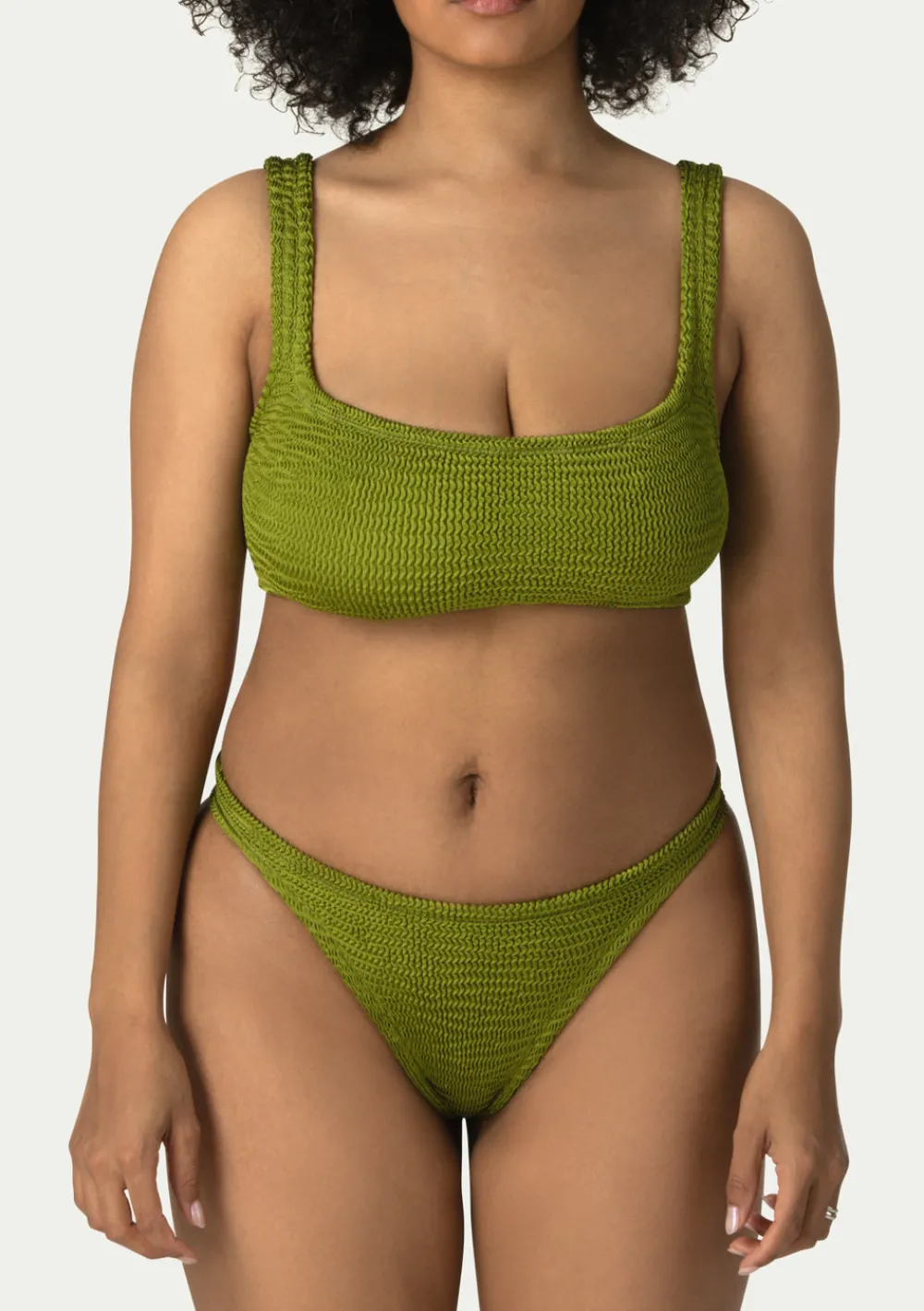 Two piece EMILY MARTINI by PARAMIDONNA. It fits through sizes from XS to 2XL. The swimsuit top is shaped like a sports bra with two straps as the bottom is low-waisted. To maintain the swimsuit’s high elasticity and bright color, please handwash it with soap and warm water. Do not tumble-dry, only air-dry.