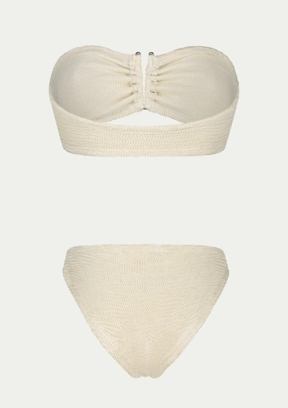 Two-piece swimsuit set FRIDA by PARAMIDONNA. The model is one-size and covers sizes from XS to 2XL. The top is a strapless bustier with a cut-out in the middle, completed by a metal accessory, while the bikini is mid-cut and low-waisted. The swimsuit allows for the collection of an even tan and highlights a great sun tan. The FRIDA half swimsuit is great for women of all chest sizes, always fits great and brings a fresh vibe. The FRIDA model is in the top 3 best selling models for the brand in all colours.