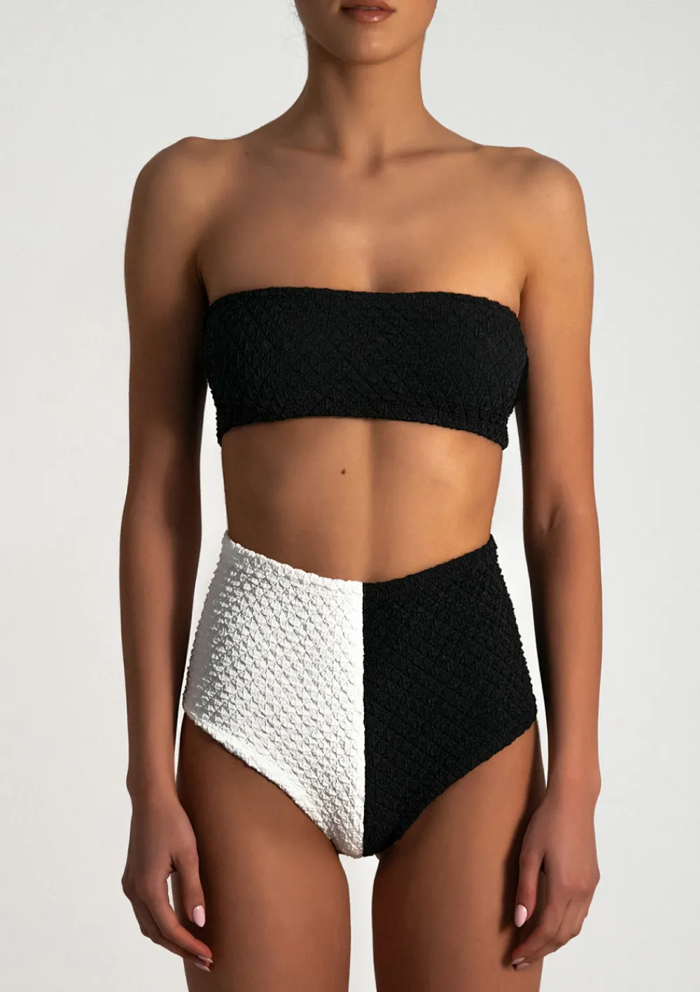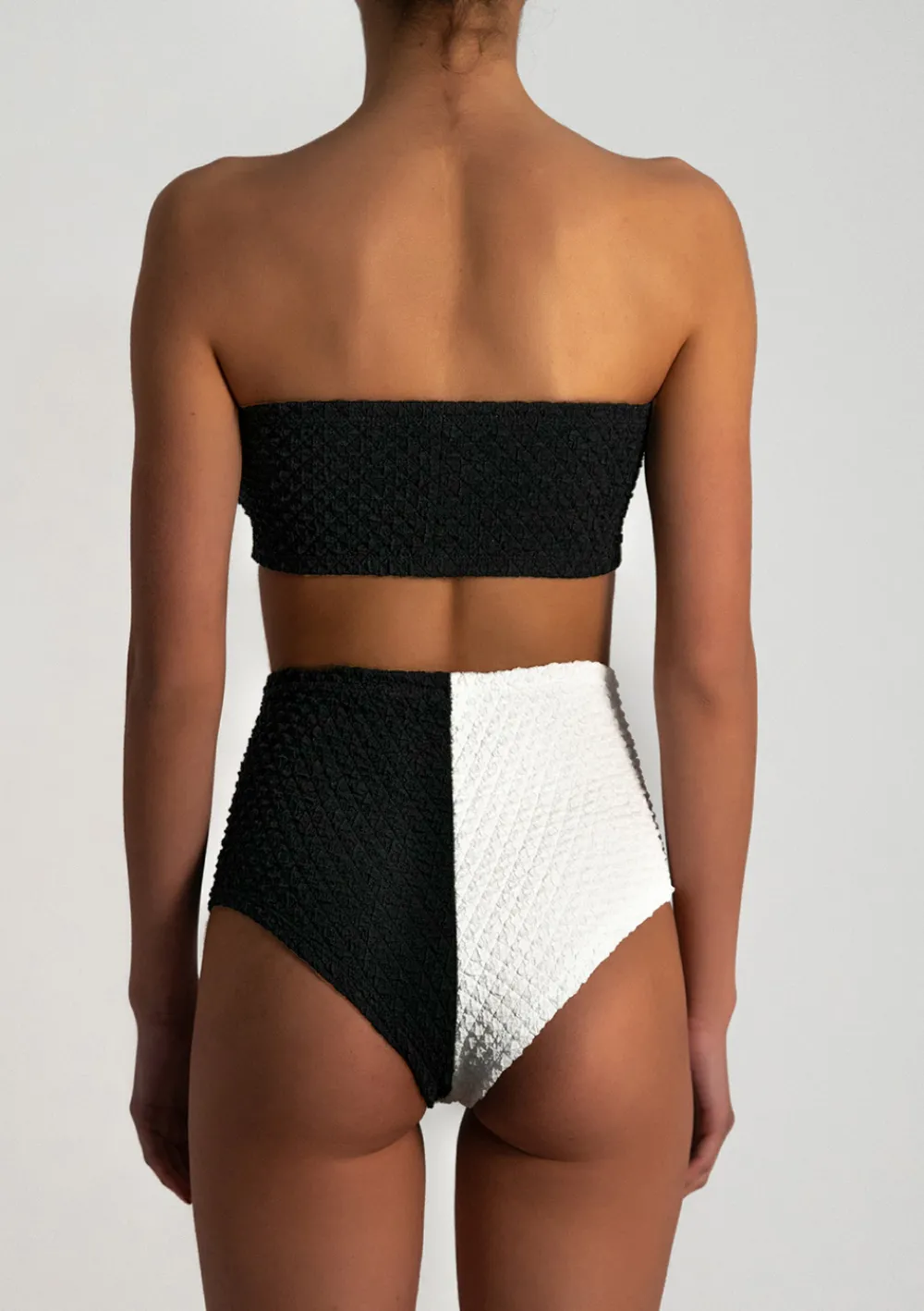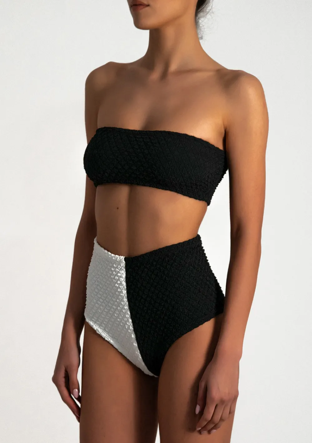 Two piece GRETA BLACK & FOAM made out from eco-friendly bubble material. The top represents a classic bandeau bikini style in black. With high-waisted bottom in black and white. To maintain the swimsuit’s high elasticity, gently hand-wash it with warm water and soap. Do not tumble-dry, only air-dry.