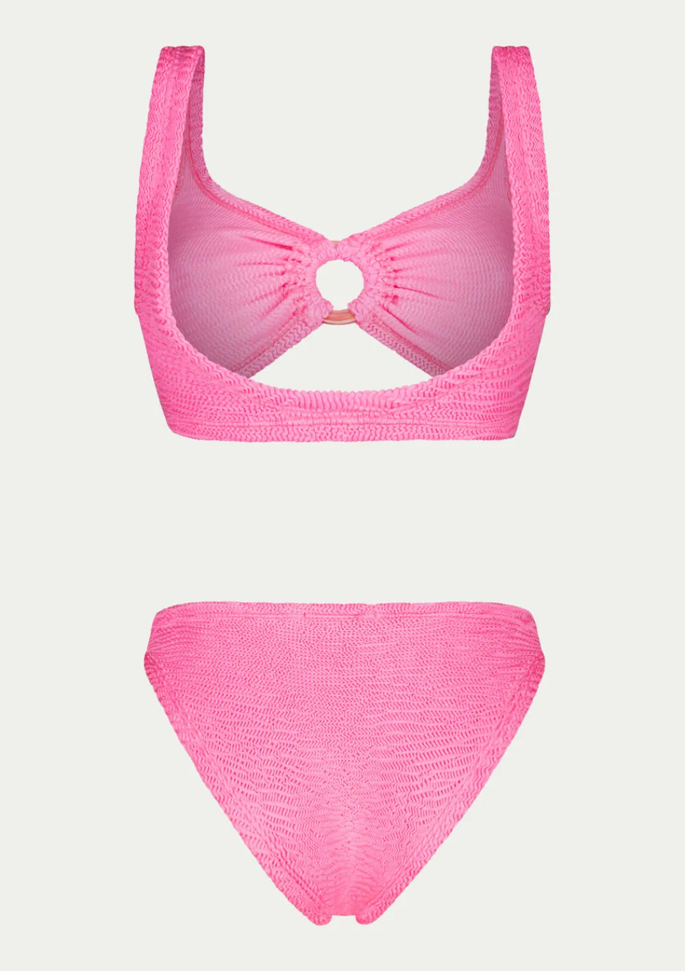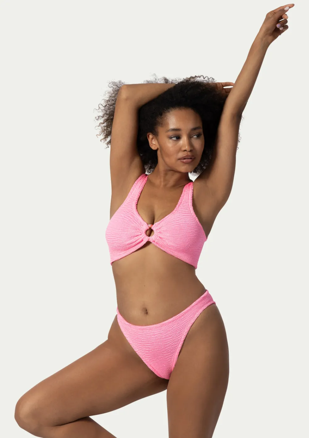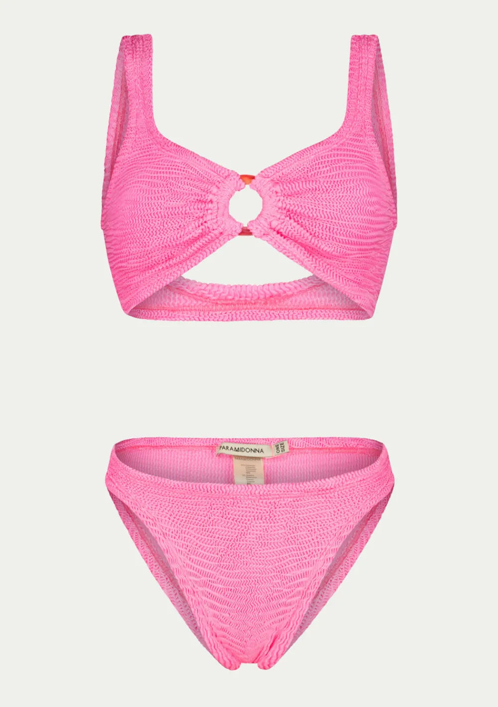 Two-piece IRINA BUBBLE GUM two-piece swimsuit by PARAMIDONNA, available in one size to fit XS to 2XL. Crafted from high-quality fabric with strong elasticity, ensuring a comfortable and secure fit for various body types. The top features a stylish two-strap bustier with a connecting decorative ring in the middle, enhancing and shaping the bust. The low-waisted bikini bottoms boast a moderate cut for a flattering silhouette. The IRINA set is PARAMIDONNA’s best-selling model, known for its exceptional stability and ability to accentuate the bust.