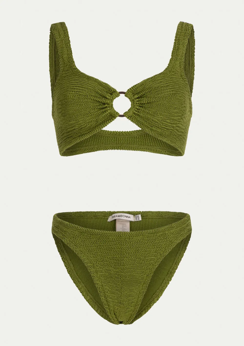 Two-piece swimsuit IRINA MARTINI by PARAMIDONNA, available in one size to fit XS to 2XL. Crafted from high-quality fabric with strong elasticity, ensuring a comfortable and secure fit for various body types. The top features a stylish two-strap bustier with a connecting decorative ring in the middle, enhancing and shaping the bust. The low-waisted bikini bottoms boast a moderate cut for a flattering silhouette. The IRINA set is PARAMIDONNA’s best-selling model, known for its exceptional stability and ability to accentuate the bust.