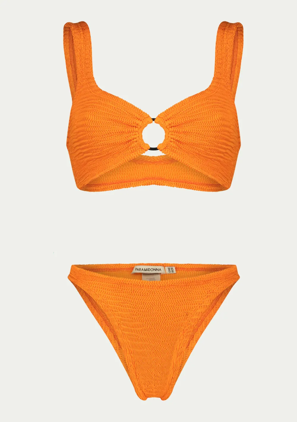 Two piece IRINA in orange color. The highly elastic material allows this one size suit to fit all between XS and 2XL. There is a frontal hoop detailing. The bottom is low-waisted. Please, follow the instructions on the care tag and hand wash the item with soap and warm water. Do not tumble-dry, only air-dry.