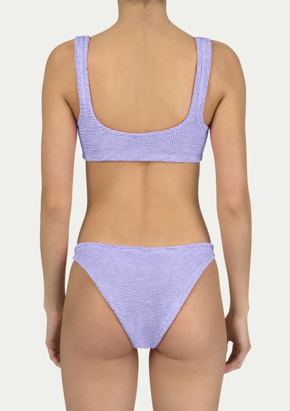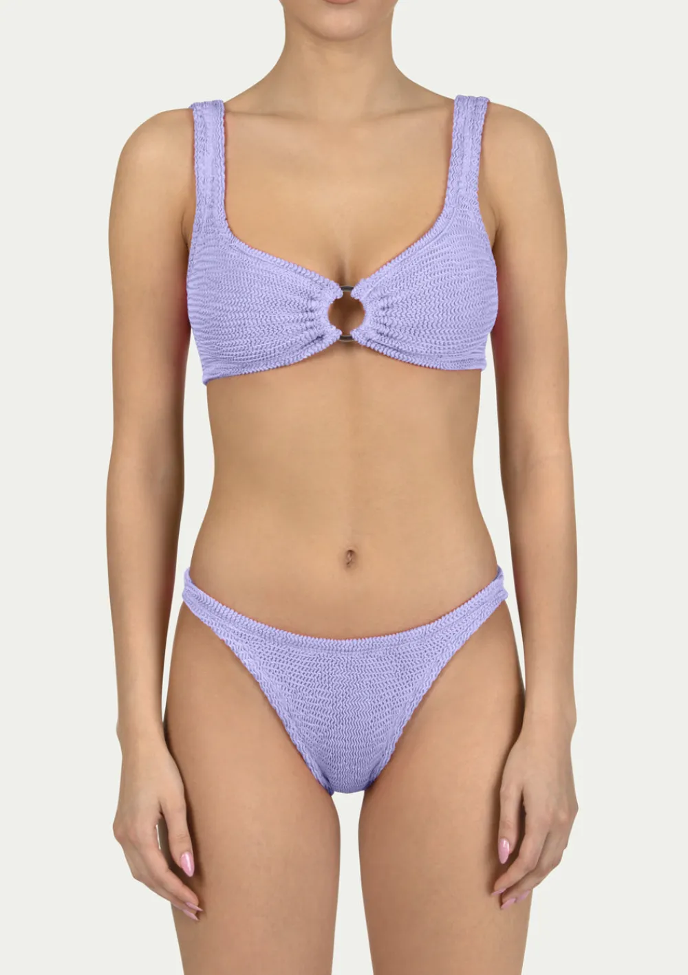 Two piece IRINA in VIOLET color. The highly elastic material allows this one size suit to fit all between XS and 2XL. There is an ornamental accessory in the middle of the top. The bottom is low-waisted. Please, follow the instructions on the care tag and hand wash the item with soap and warm water. Do not tumble-dry, only air-dry.