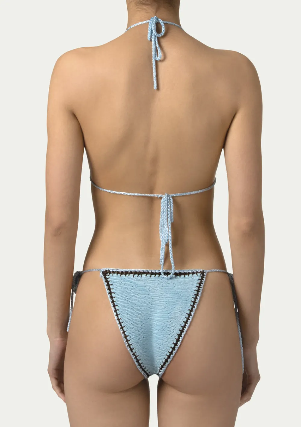 Bikini KAIA in sky blue color by PARAMIDONNA. The top features triangular bra cups with hand knitted details and ties at the neck and back. The bottom is low-waisted, adjustable and tying on the hips. Medium coverage. One size. Please, hand wash this item with warm water and soap. Do not tumble-dry, only air dry.