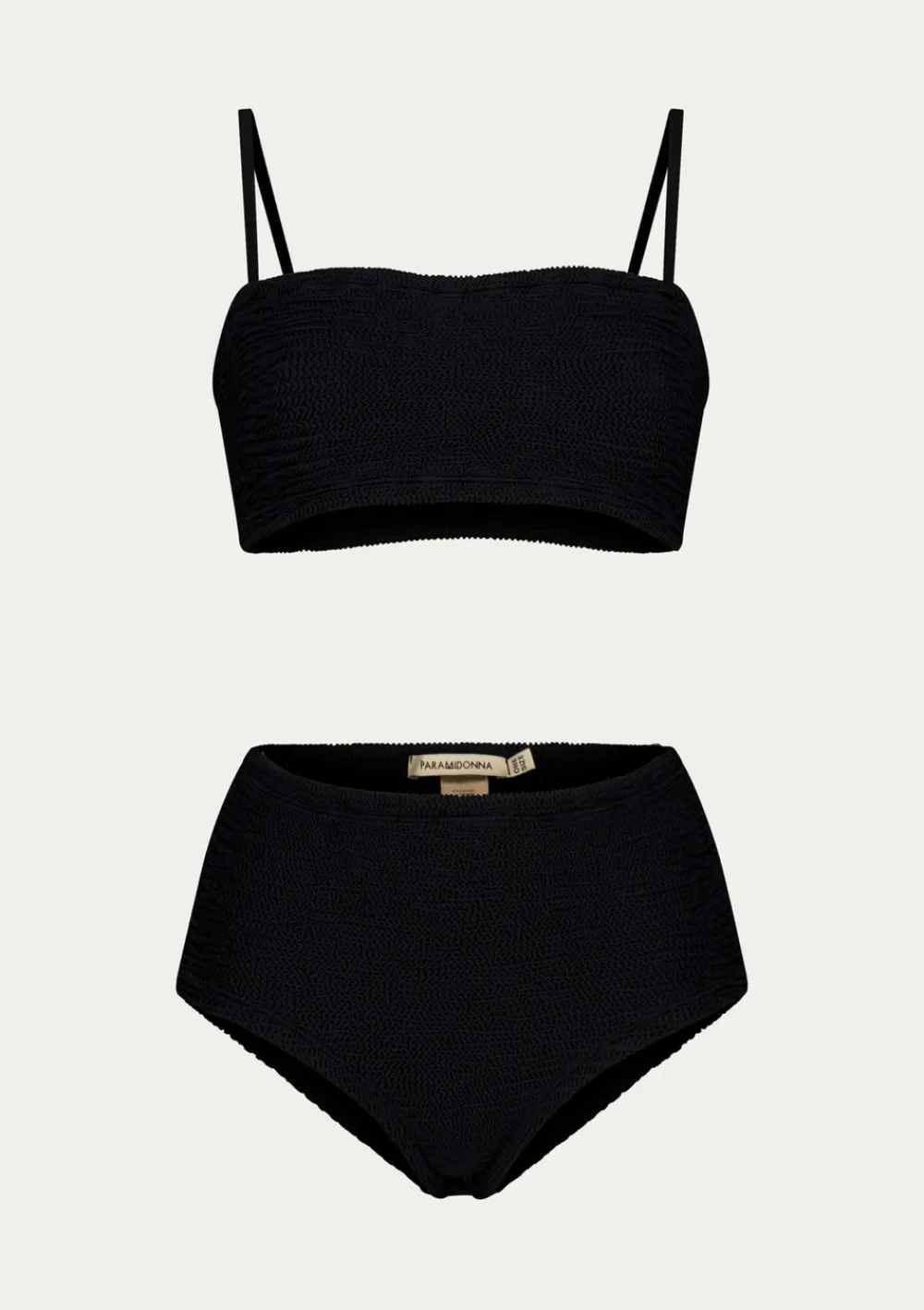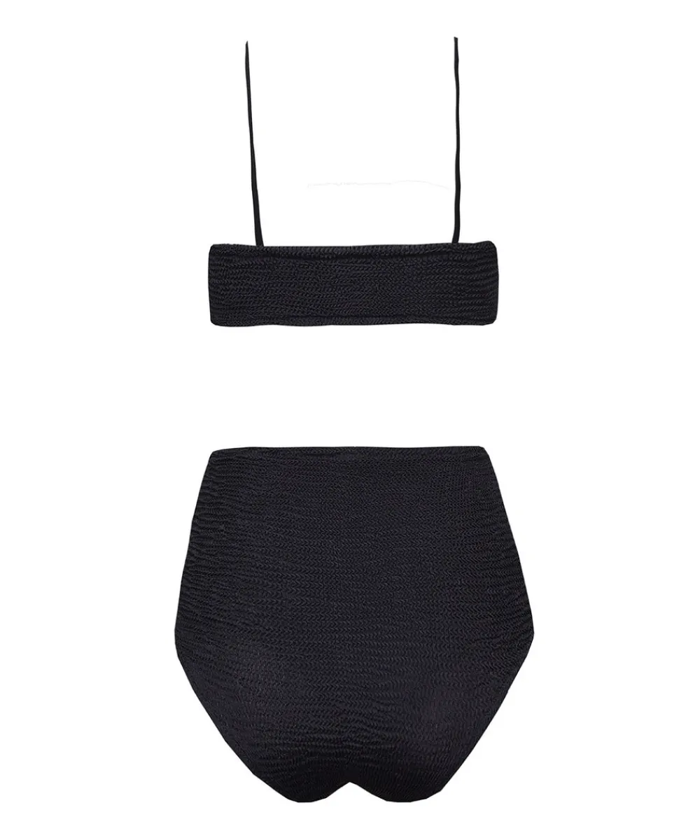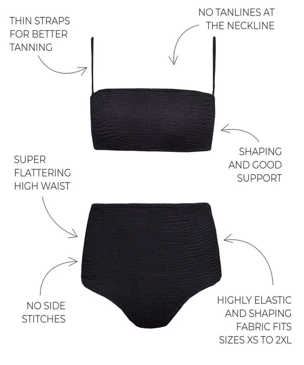 High-waisted two-piece swimsuit set MARIE in black is made of highly elastic fabric and is one size model. Suitable for sizes XS to 2XL. The bikini top has two straps and provides good support for you. To maintain the swimsuit’s high elasticity, gently hand-wash it with warm water and soap. It is also possible to machine-wash it on low heat and a delicate wash cycle with a detergent that’s suitable for swimsuits and delicate fabrics. Do not tumble-dry, only air-dry.