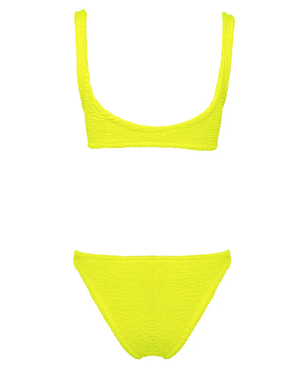 Cut out one piece swimsuit in neon yellow color. It is made of very elastic fabric which fits through sizes from XS to 2XL. The material offers durability, support and comfort at the same time. There is a silver hoop accessory, connecting the top and the bottom. To maintain the swimsuit’s high elasticity, gently hand-wash it with warm water and soap. Do not tumble-dry, only air-dry.