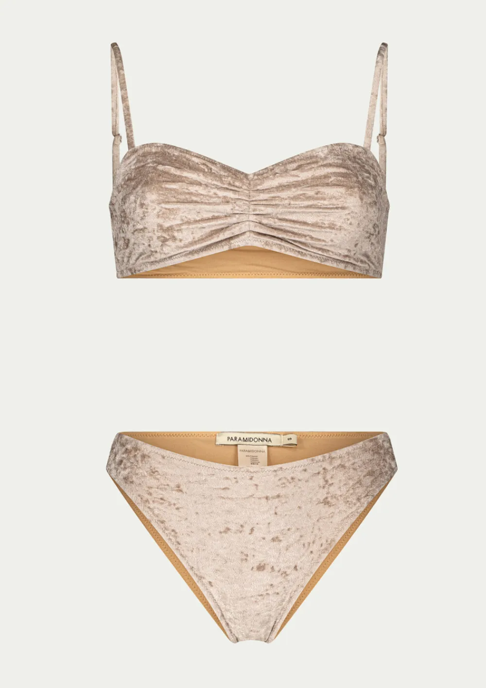 Two-piece CHIARA SHELL WHITE by PARAMIDONNA is available in sizes S, M, and L. The bustier-style top is elegantly ruched in the middle, adding dimension to the bust for a sleek and flattering appearance. The bottom showcases a chic V-shaped line, along with a mid-cut and low waist, ensuring a perfect blend of style and comfort. Crafted from high-quality fabric, this swimsuit dries quickly and boasts a delightful plush feel to the touch.